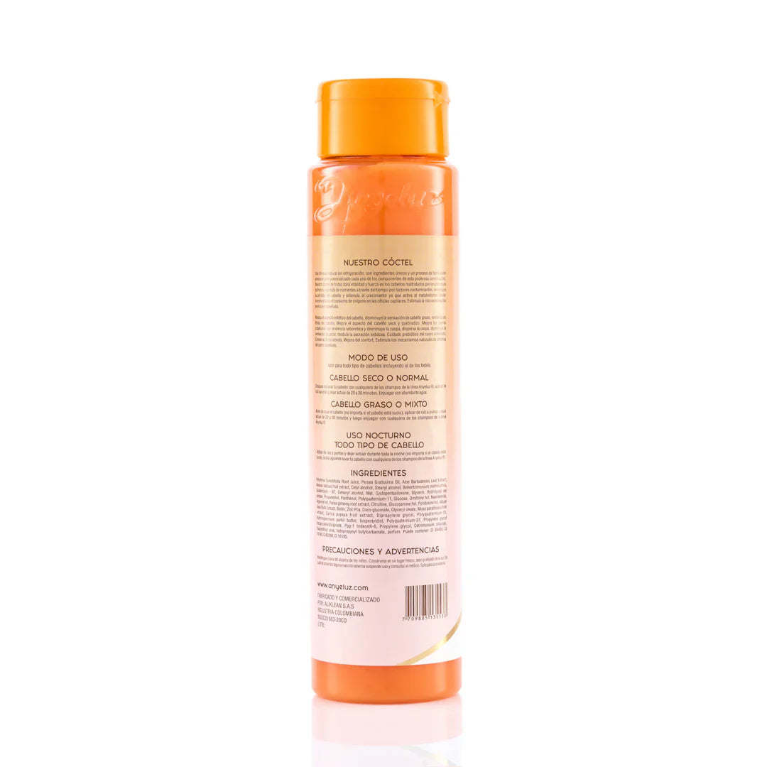 - Cabello seco o normal: Después de lavar tu cabello con cualquiera de los shampoo de la línea Anyeluz®, aplicar de raíz a puntas y dejar actuar de 20 a 30 minutos. Enjuagar con abundante agua.